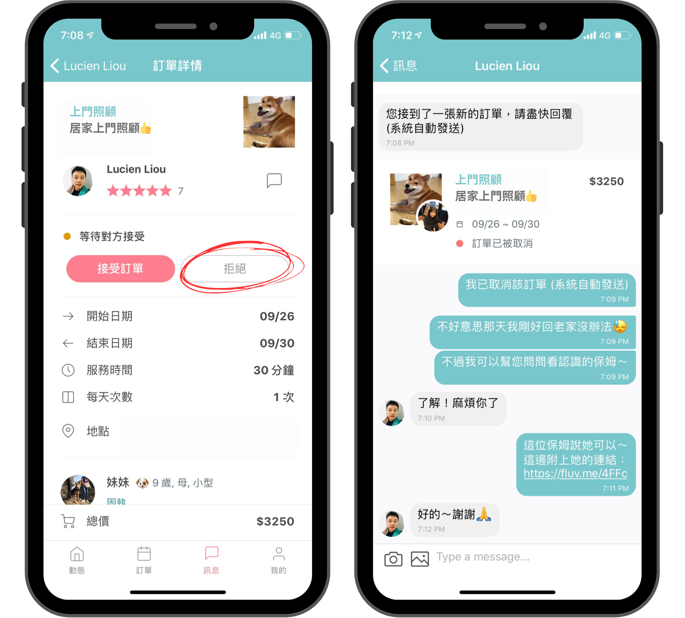 若時間上或是照顧內容無法配合接單,請禮貌上主動告知飼主原因再操作拒絕訂單。