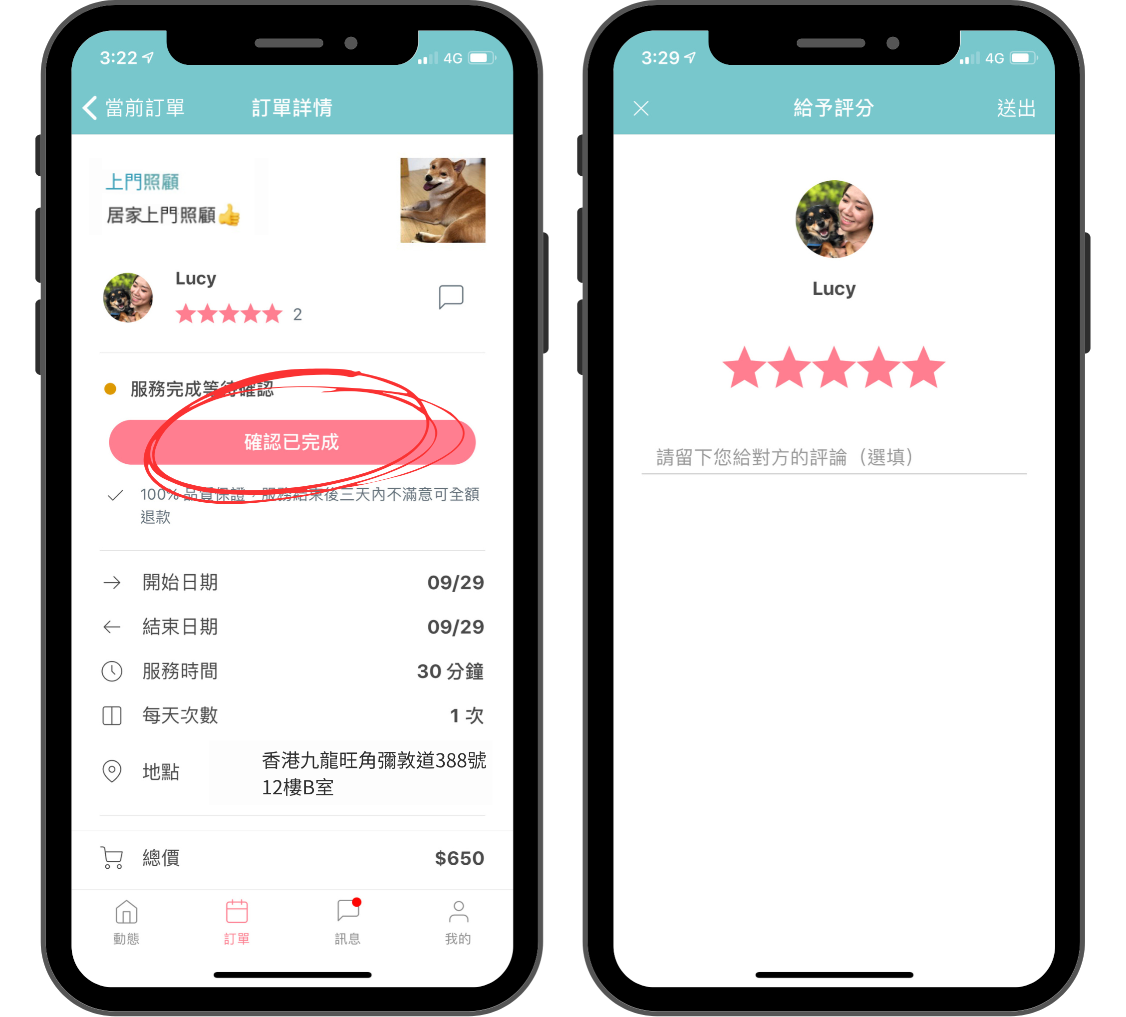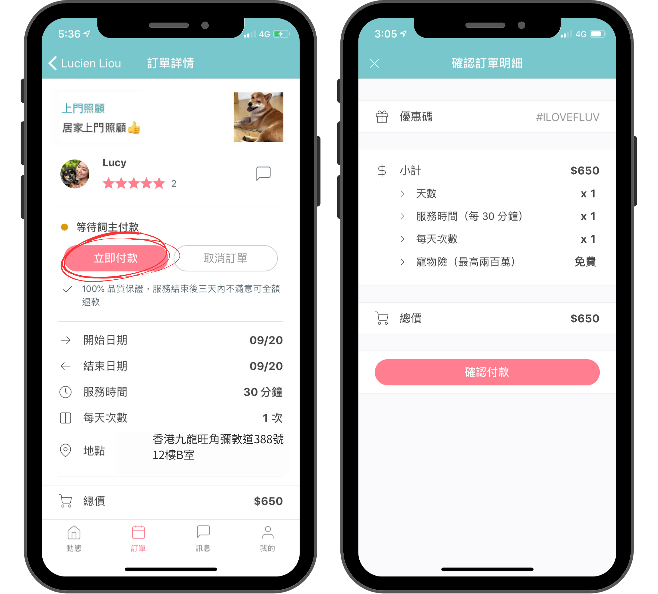 確定下單(如有優惠碼在此步驟輸入),同時於App內刷卡付款,確認飼主已付款後,保姆就可以幫飼主保留時間並等待時間去服務。