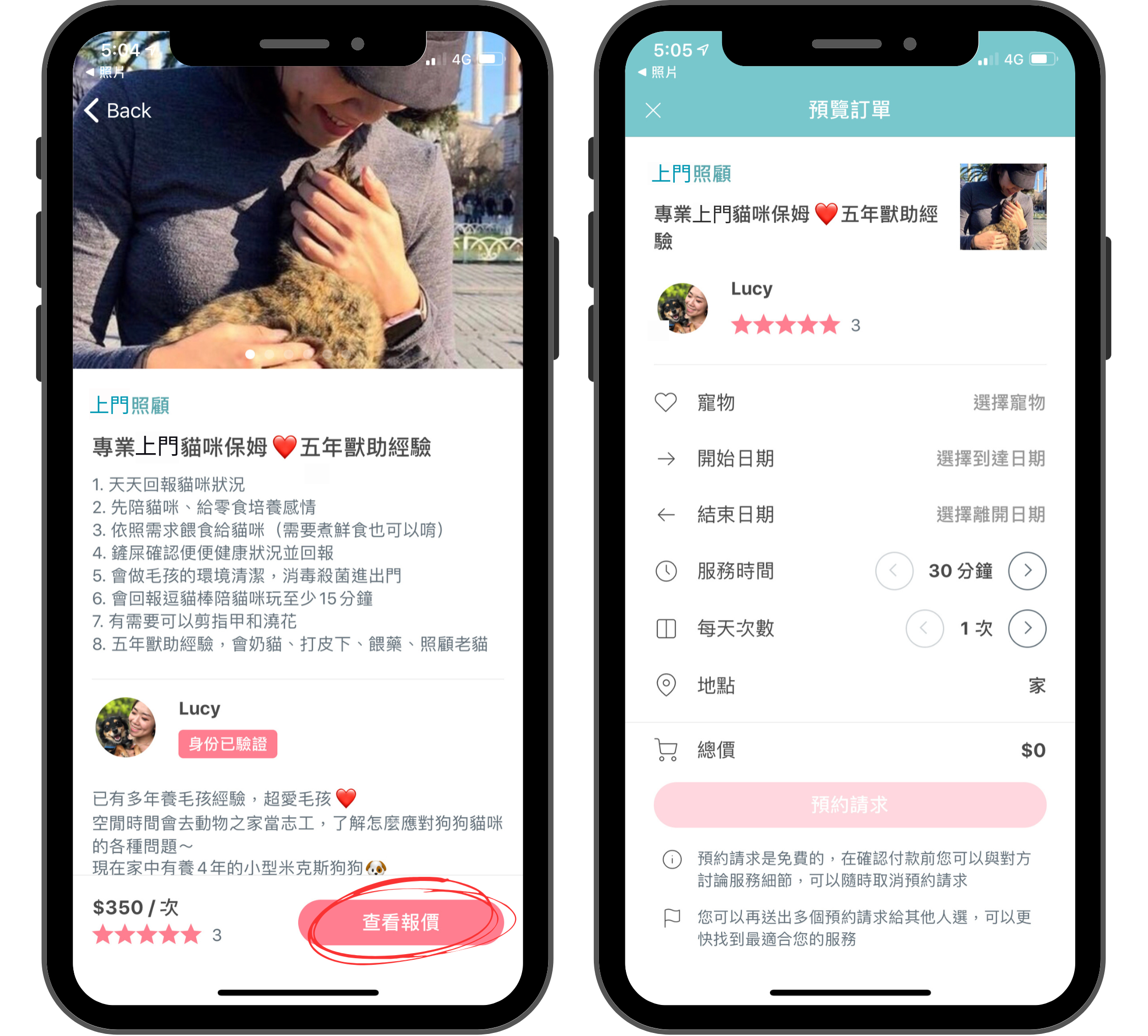 ⚠️需注意飼主的寵物需為服務接受寵物種類與大小、地點需在服務區域內、日期要在可服務時間內,否則無法送出預約請求。