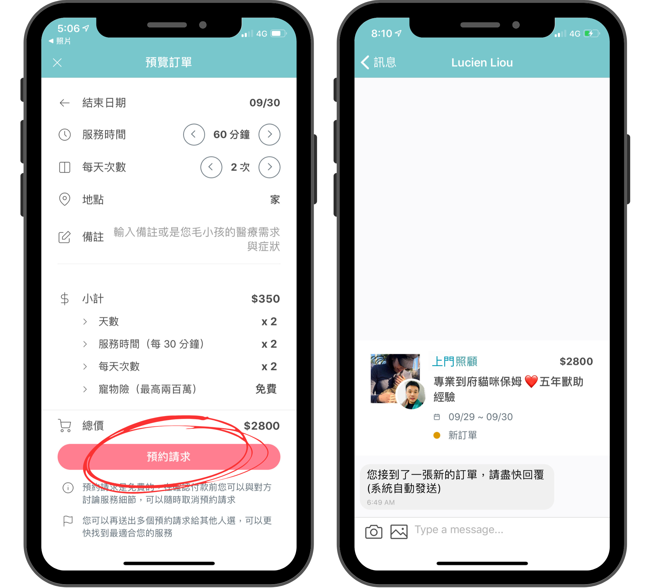 填寫完寵物、日期、時間長度、次數、地點、等每個欄位資料後,便能點擊「預約請求」送出請求,保姆就會收到請求,並可以開始與飼主訊息溝通或約家訪。